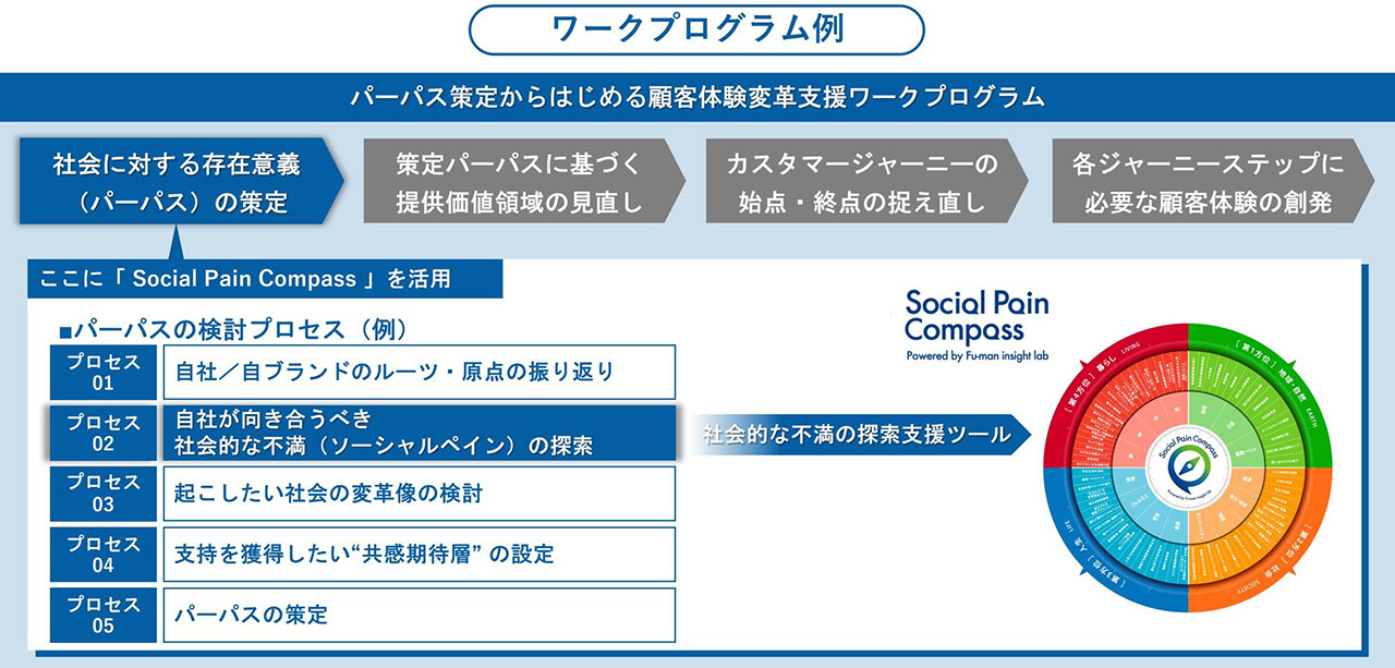 Fu-man insight lab®では、「Social Pain Compass」を活用し、企業が「"パーパス"のある、DX・CX変革」を成し遂げるためのコンサルティング支援を強化します。既存事業の改善、新規事業の構想など中長期的なDX・CX変革のプランを描いていく際に、テクノロジーが先行するあまり、つい抜け落ちてしまいがちな、"その変革によって、自社がどんな社会課題を解決し、社会に対してどのような存在意義(パーパス)を発揮できるのか?"について、本ツールを活用し議論・合意形成。そして合意した"パーパス"を実現していくために、真に必要な顧客体験の創造を、ワークショップ形式で支援します。
