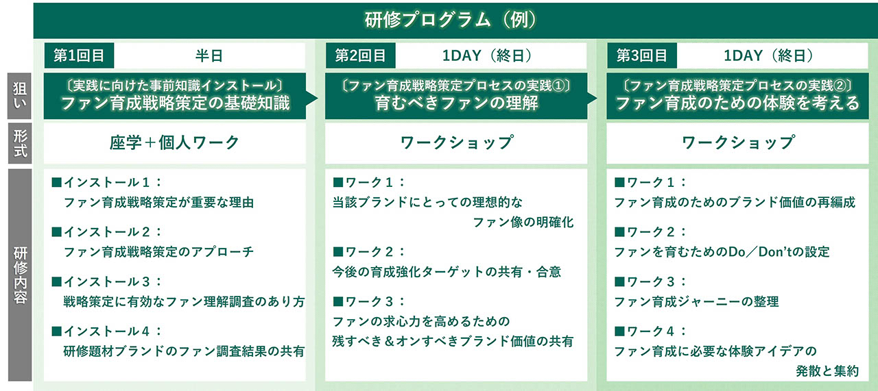2日半、全3回にわたって実施します。1日目は座学や個人ワークを通じ、ファン育成戦略を策定するにあたって必要な基礎知識のインプットを行い、2・3日目はワークショップ形式で、実際に戦略策定に必要な要素を集中的に議論していきます。ファン育成戦略策定の起点となるファン理解調査(Co-ファンリサーチ)の適切な設計方法を学ぶと共に、研修プログラムの一貫として実際に調査を行うことで、現状のファンパワーや、ファン化のプロセス、またファンの求心力を高める期待体験などについて理解を深めます。それらの調査結果を踏まえながら、当該ブランドにとっての理想的なファン像の明確化やファン育成のために必要なジャーニーの整理など、ワークショップを通じて戦略策定のポイントを体得できる研修プログラムを提供します。