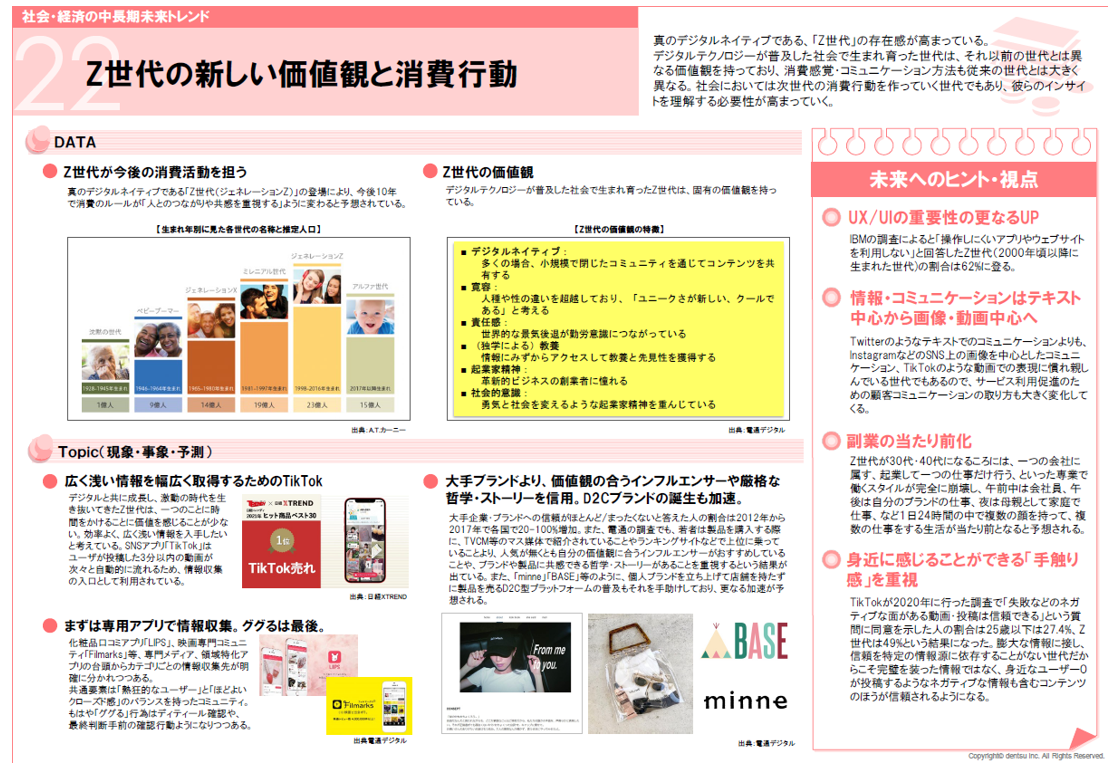 デジタルネイティブかつ、今後の消費活動を牽引するとされるZ世代。彼ら固有の価値観やSNSを介した日々の行動を紹介し、未来の消費活動と商機を紐解きます。