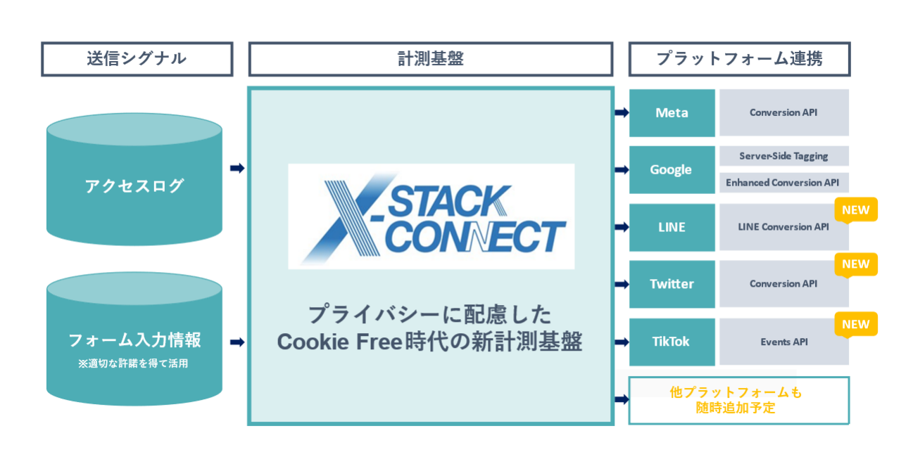 これまで「X-Stack Connect」の対応可能なプラットフォームはGoogle 社とMeta社に限定されていましたが、この度新たに、サーバーサイド計測を実現するためのデータ送信機能としてLINE社より提供開始された「LINE Conversion API」、Twitter社の「Conversion API」、そしてTikTok for Businessの「Events API」に対応し、広告主企業の幅広いマーケティング施策に活用できる体制を整えました。