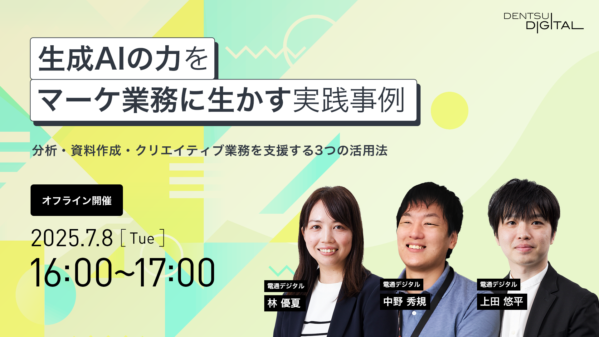 本セミナーでは、電通デジタルが構築・実践してきた生成AIの活用事例から、「分析」「資料作成」「クリエイティブ反応シミュレーション」といった日々の実務を効率化し、より質の高いアウトプットを実現するためのソリューションを厳選してご紹介します。さらに、Google Cloud を活用した実装アーキテクチャや導入業務効果についても解説します。