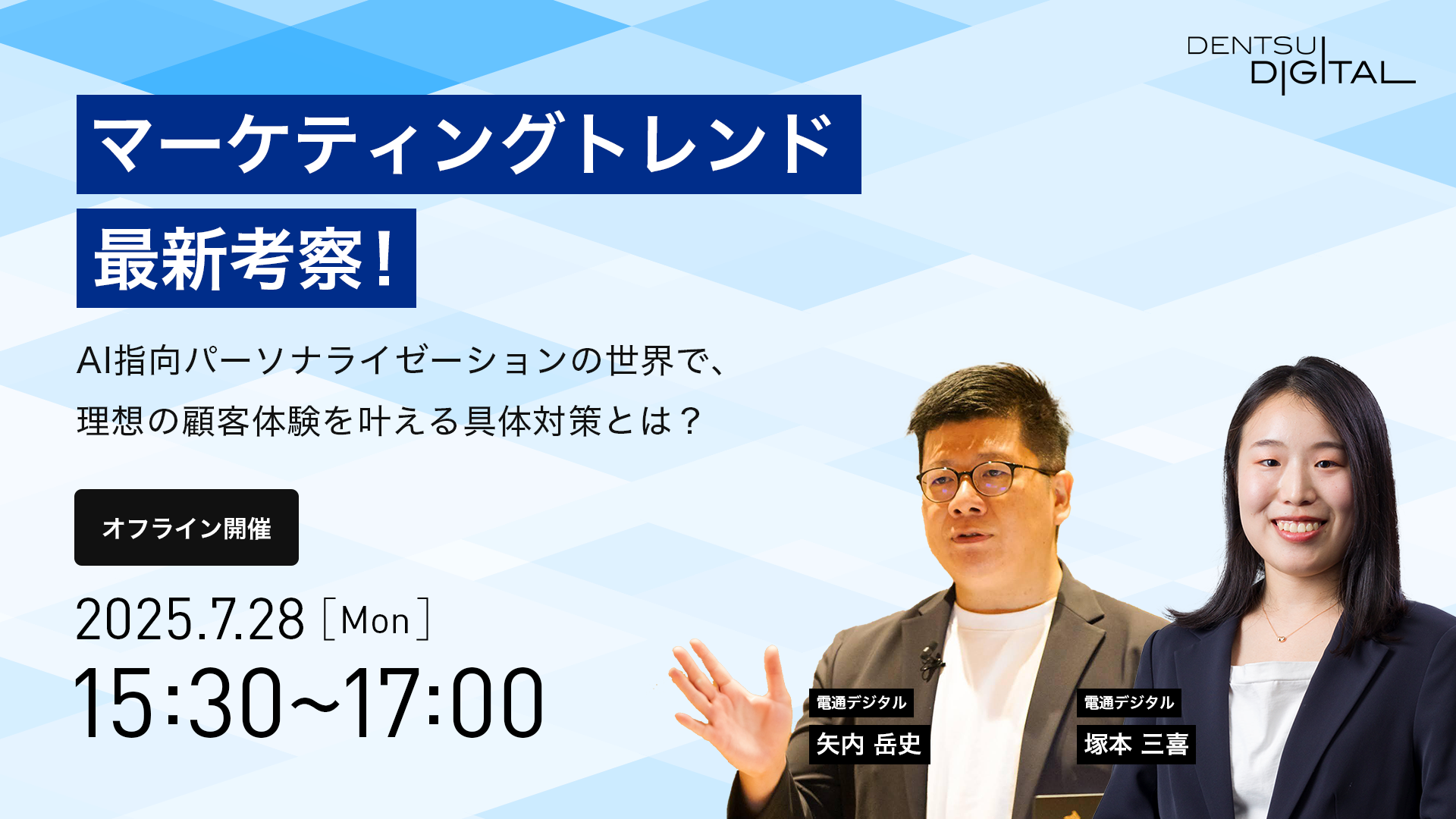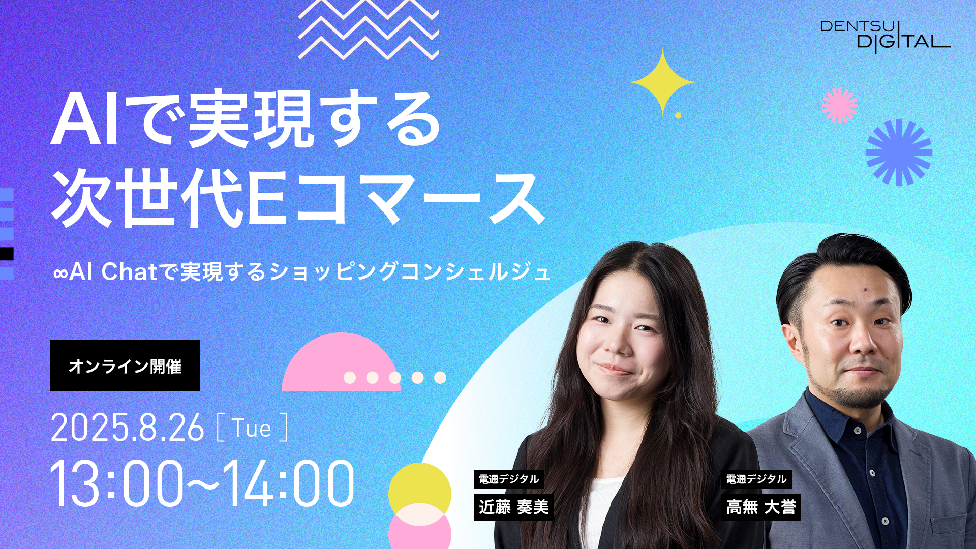電通デジタルは、AIの黎明期から、いちはやくマーケティング領域でのAIによる事業成長・業務効率化をご支援して参りました。「AI Hacked Marketing Meetup」は、電通デジタルが培ってきた経験と、「∞AI」をはじめとする最新のAIソリューションに基づき、マーケティングがどのように今後変わるのか、未来展望と実践事例、ソリューションをご紹介するトークセッションです。