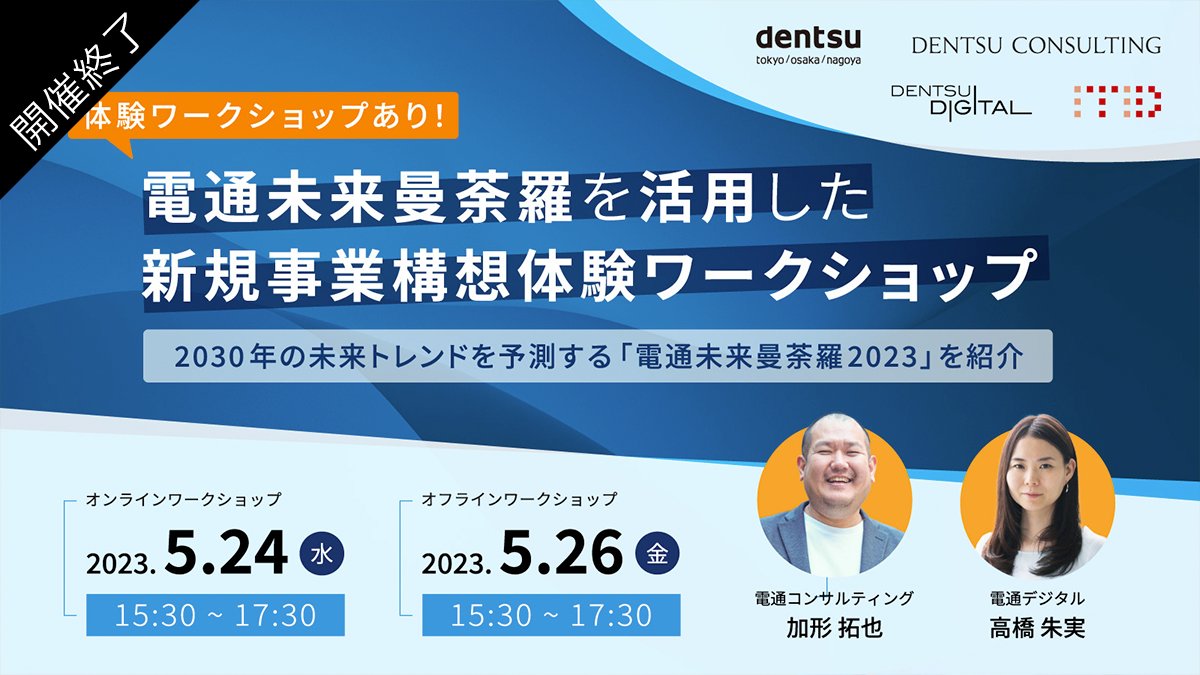 本ワークショップでは、未来で予想される事象・トレンドのご紹介に加え「未来曼荼羅2023」を活用した新規事業開発プログラムの一部を実際に体験していただきます。展開する事業にとって重要な外部環境の変化を特定し、どのように「未来曼荼羅2023」を使って新たな事業開発へ着想するのかをお伝えします。