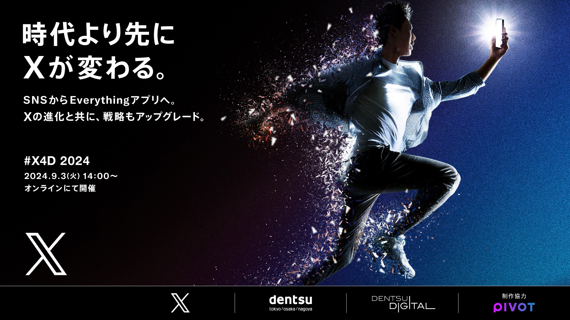 今年で9回目となる、X(Twitter Japan)・電通・電通デジタルが共催する、#X4Dentsu2024(XforDentsu)を開催します。今年は「時代より先にXが変わる」をキーワードに人気急上昇中のビジネス映像メディア「PIVOT」とタイアップし、PIVOT人気番組のスピンオフ企画として、X4Dentsuをお届けします。