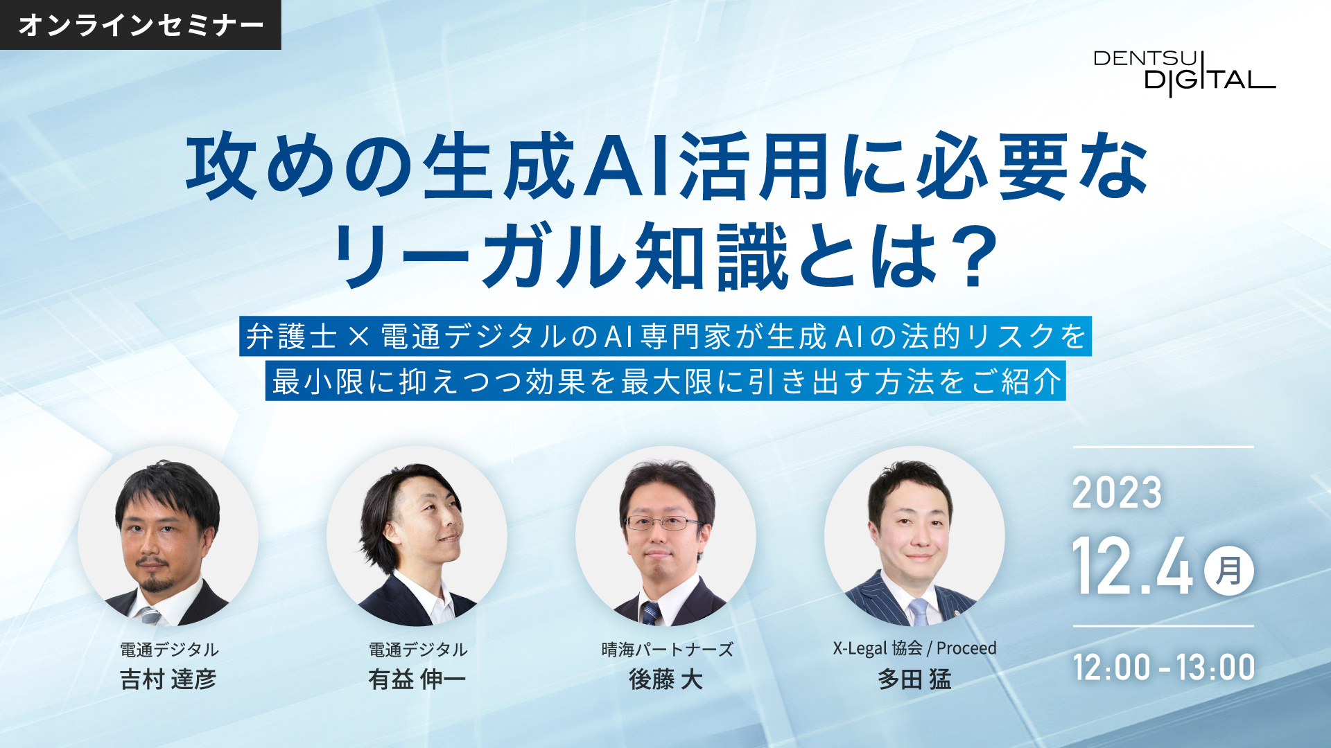 本セミナーでは、晴海パートナーズ法律事務所のマネージングパートナーである後藤 大氏と、一般社団法人X-Legal協会の代表理事であり、弁護士法人Proceedの代表弁護士である多田 猛氏をお招きし、生成AIをビジネスに統合する際の法的留意点に焦点を当て、実践的な対応策を座談会形式でお届けします。