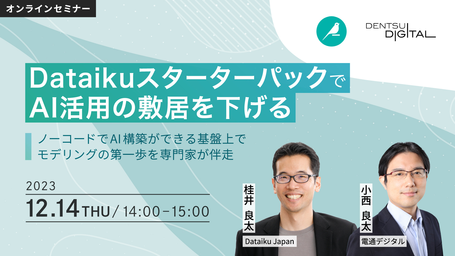 本セミナーでは、ノーコードで高度なデータ分析・機械学習を実行できるツール「Dataiku」をご紹介。また、「Dataiku」を活用し、初期のデータ分析・機械学習モデリング構築・運用を伴走型でご支援するスターターパックをご紹介します。