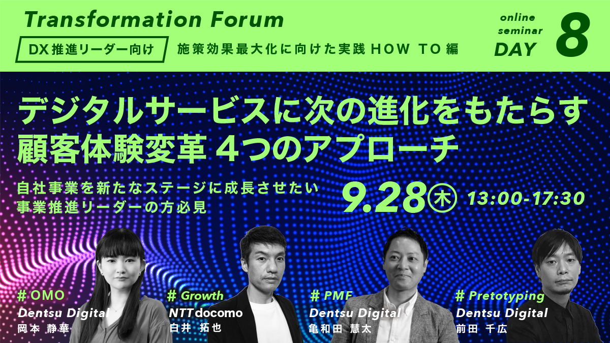 顧客体験変革を軸に、「OMO」「グロース」「PMF」「プレトタイピング」といった4つの視点から、課題解決に向けた実践的な打ち手を、事例を交えてご紹介します。