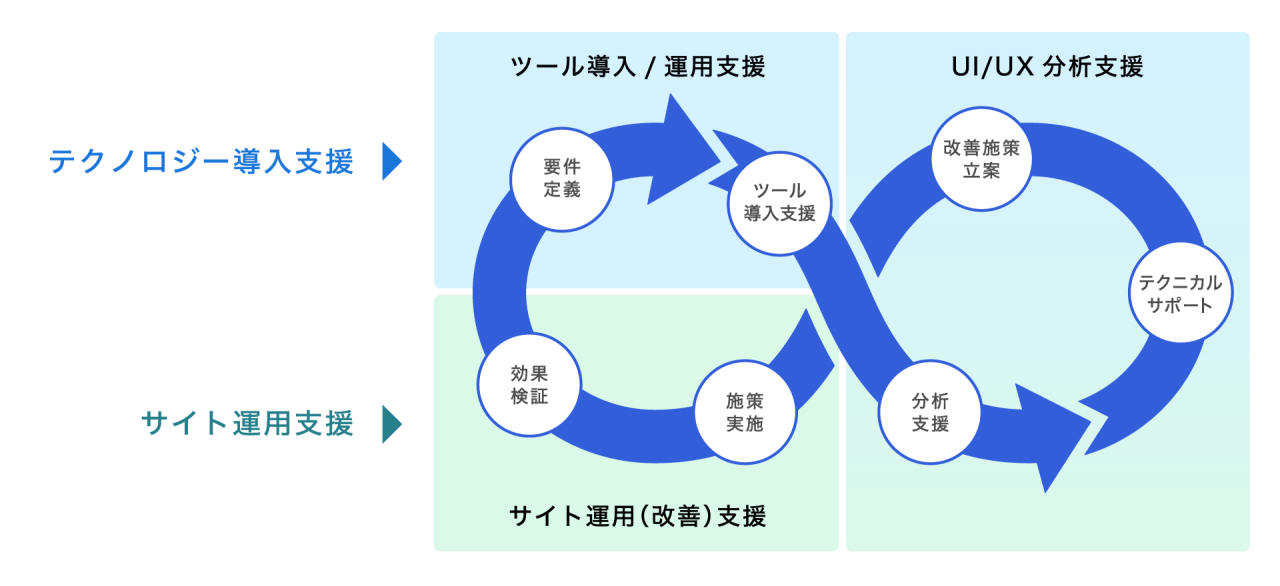 テクノロジーの導入面とサイト運用面の両側から、顧客体験に関わる課題を解決に導きます。
