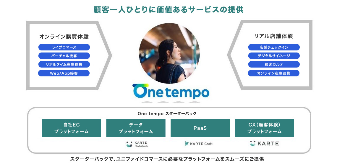 電通デジタルでは、オンライン・オフラインのデータを統合し、顧客一人ひとりに寄り添った良質な購買体験を実現するユニファイドコマースソリューション「One tempo」を提供しています。