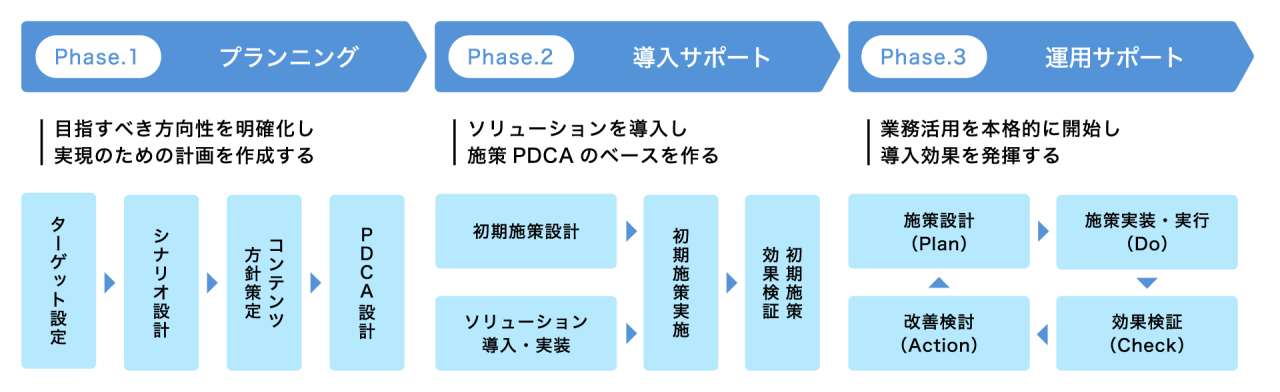 電通デジタルでは、数十社以上のマーケティングオートメーション導入実績、フルラインでの幅広いプロジェクト支援をもとに、クライアントのあらゆる要望に合わせて強力なサポートができます。