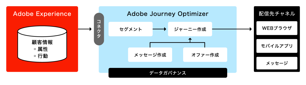 Adobe Journey Optimizerの特長を生かして、Adobe Experience Platformが持つリアルタイムかつ一元化された顧客プロファイル情報をもとに、メールやプッシュ通知等の多様なチャネルで最適なコンテンツやオファーをタイミングよく提供することが可能となります。