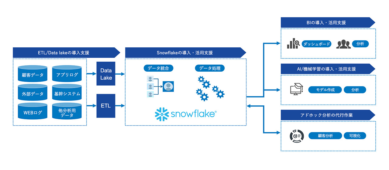 Snowflakeを中心としたクラウドファーストで保守・運用業務負荷の低い分析基盤・マーケティング基盤を構築したい企業様向けのサービスです。