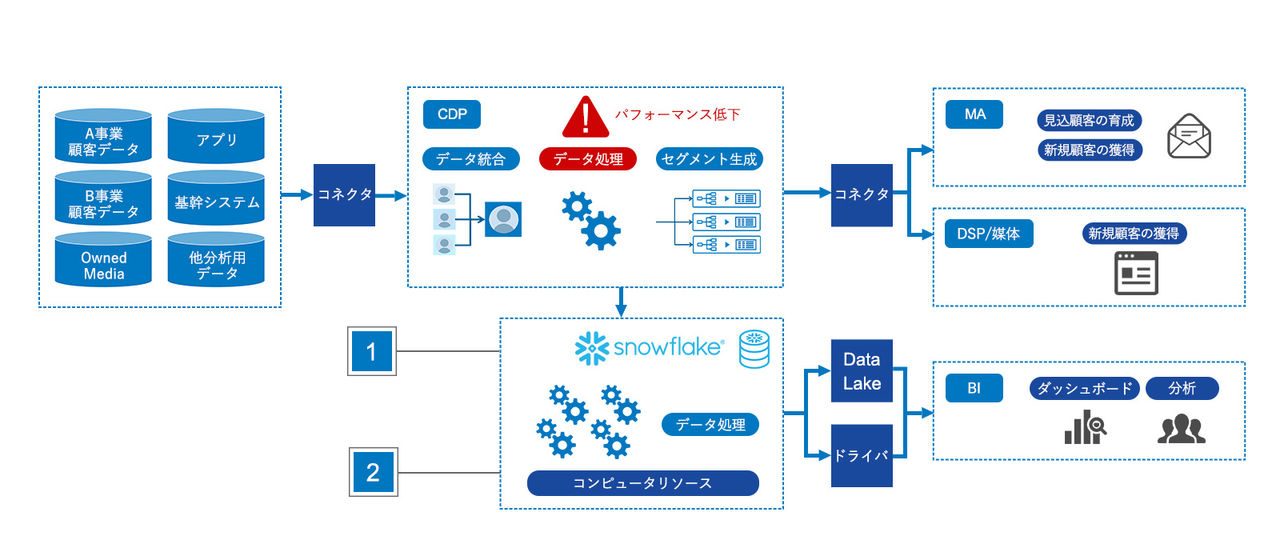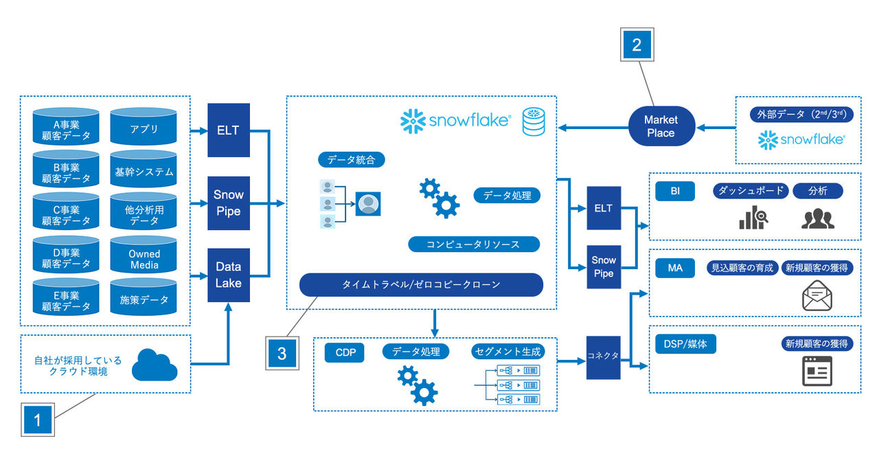 Snowflakeを中心としたクラウドファースト(ETL、BI、MAなどの製品は選択可能)で保守・運用業務負荷の低い分析基盤・マーケティング基盤を構築したい企業様向けのサービス | 導入期間