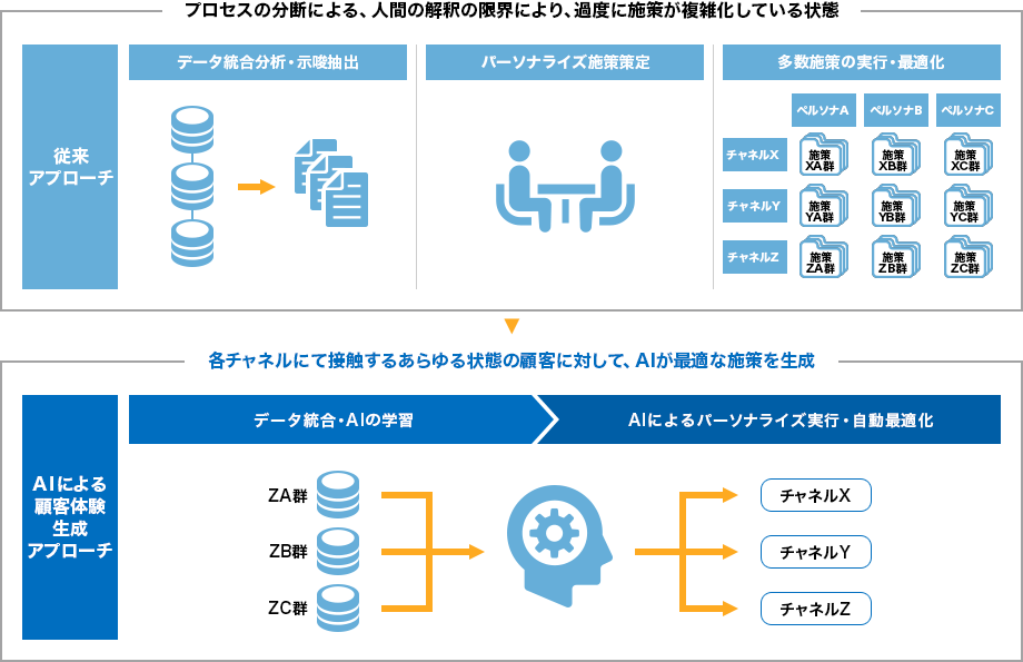 従来であれば、属人的な経験や知見によるところも大きく、多くの人手によって実行されていたデジタルマーケティングをAIによって高度化・自動化を図る支援を行います。