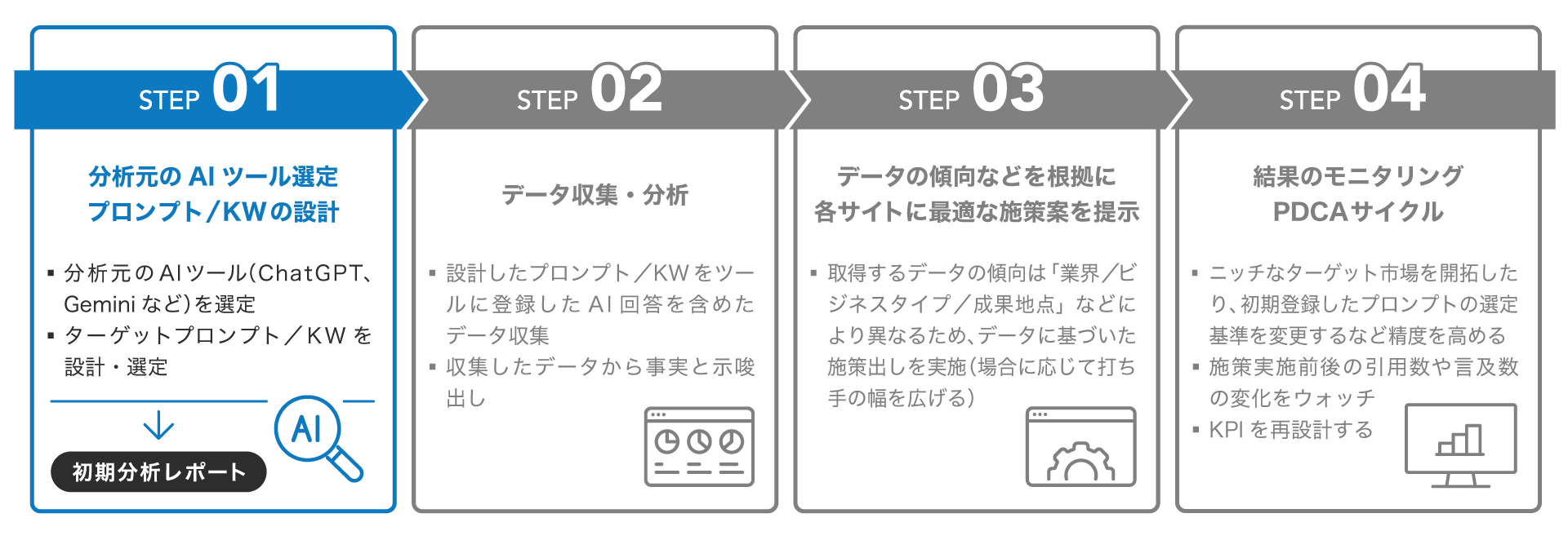 本サービスは、まず約1カ月間で完了する 「初期分析レポート」 から開始し、貴社のChatGPTやGeminiなどの各LLMやGoogle検索のAI Overviews対応における現状と課題を明確にします。この初期分析を通じて、具体的な戦略の方向性や期待される成果を事前に把握いただけます。