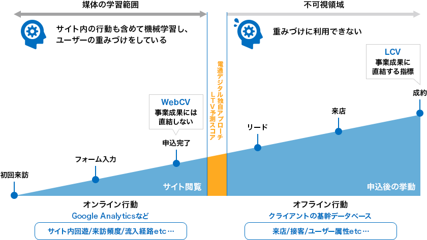 デジタル広告では、媒体の自動入札機能が進化した結果、Web上の行動に基づく高精度なユーザーターゲティングが可能になりました。しかし、Web上でのコンバージョン後の行動、すなわち来店を起点とし、店舗での購買、成約、LTV(顧客生涯価値:Life Time Value)までの一連の流れといった、企業が保有している顧客ごとのCRMデータまで加味したターゲティングは困難なケースがほとんどです。電通デジタルでは、Web上のデータと自社保有データのギャップを埋める予測スコアのモデリングと、予測スコアを自動入札に反映させる運用を提供可能です。オンラインデータのみで最適化していた既存広告運用と比べ、企業のより深いビジネス指標であるLTV向上に直結したデジタル広告運用を提供することが可能です。