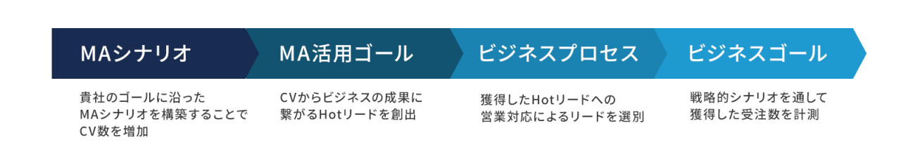 マーケティング戦略とMAシナリオ構築の2軸で進めていくことで、ビジネスに成果をもたらすリードを創出し、効果を測定するプロセスの構築を実現します。