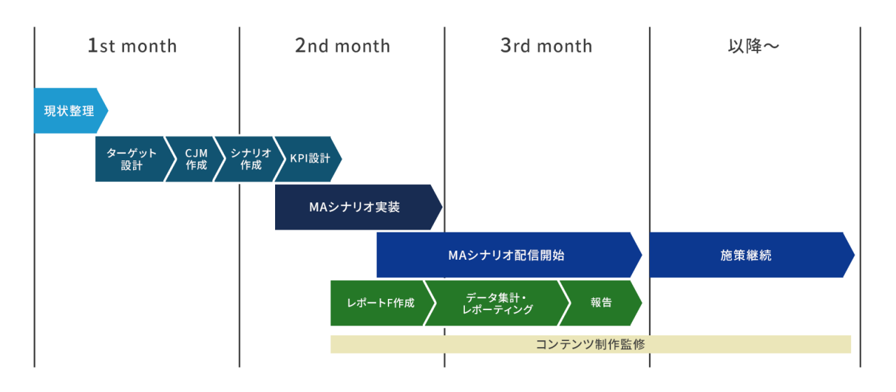 最短1カ月でシナリオ完成までを実施。1.5カ月でメール配信開始が可能となっております。